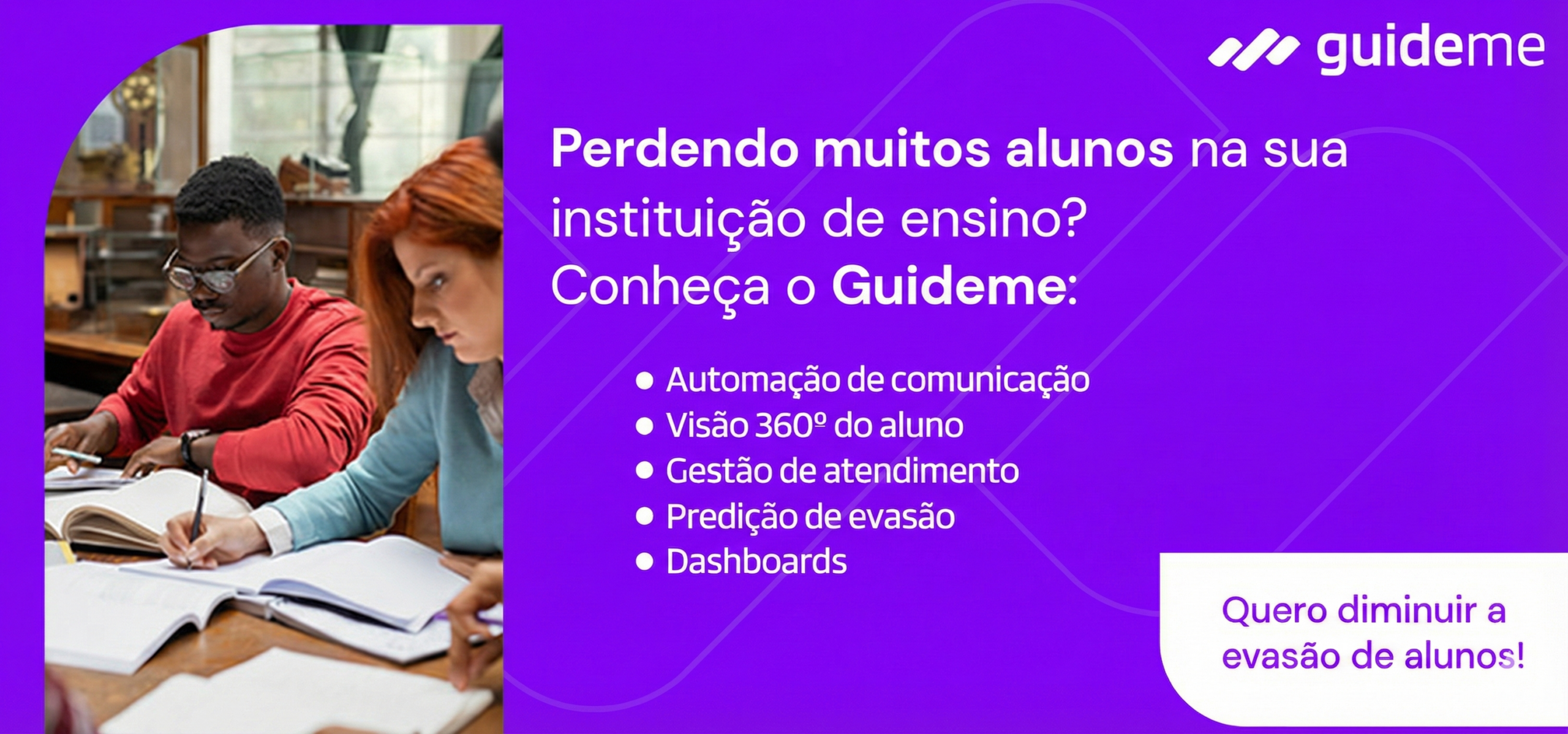 Apesar disso, existem ferramentas que permitem não só identificar essas causas, mas também as prever e ajudar a combatê-las. Uma dessas é o Guideme, é o software de relacionamento definitivo para te apoiar na permanência de seus alunos.